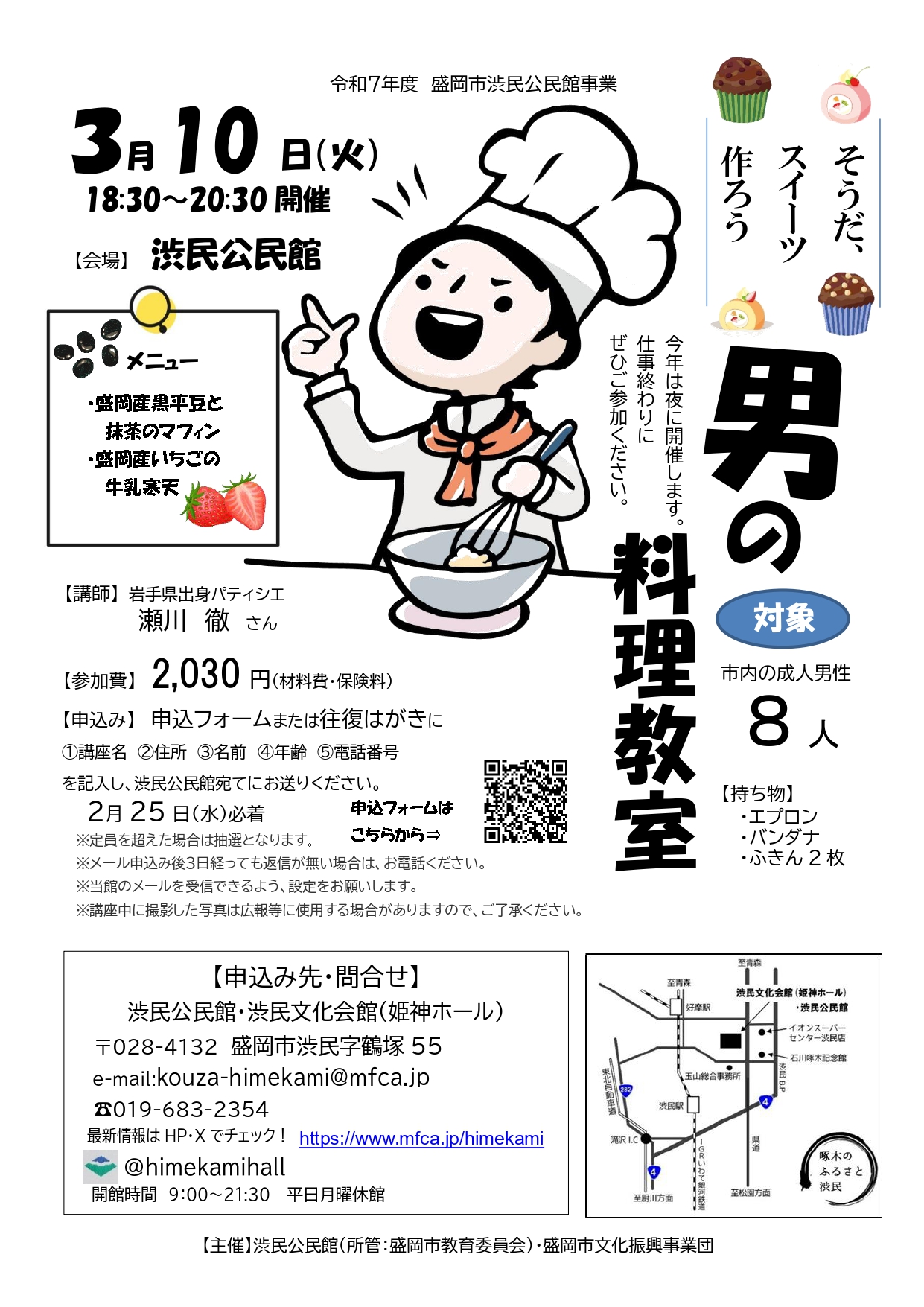 申込フォームまたは往復はがきに①講座名②住所③名前④年齢⑤電話番号を記入し、渋民公民館宛てにお送りください。 2月25日(水)必着 ※定員を超えた場合は抽選となります。