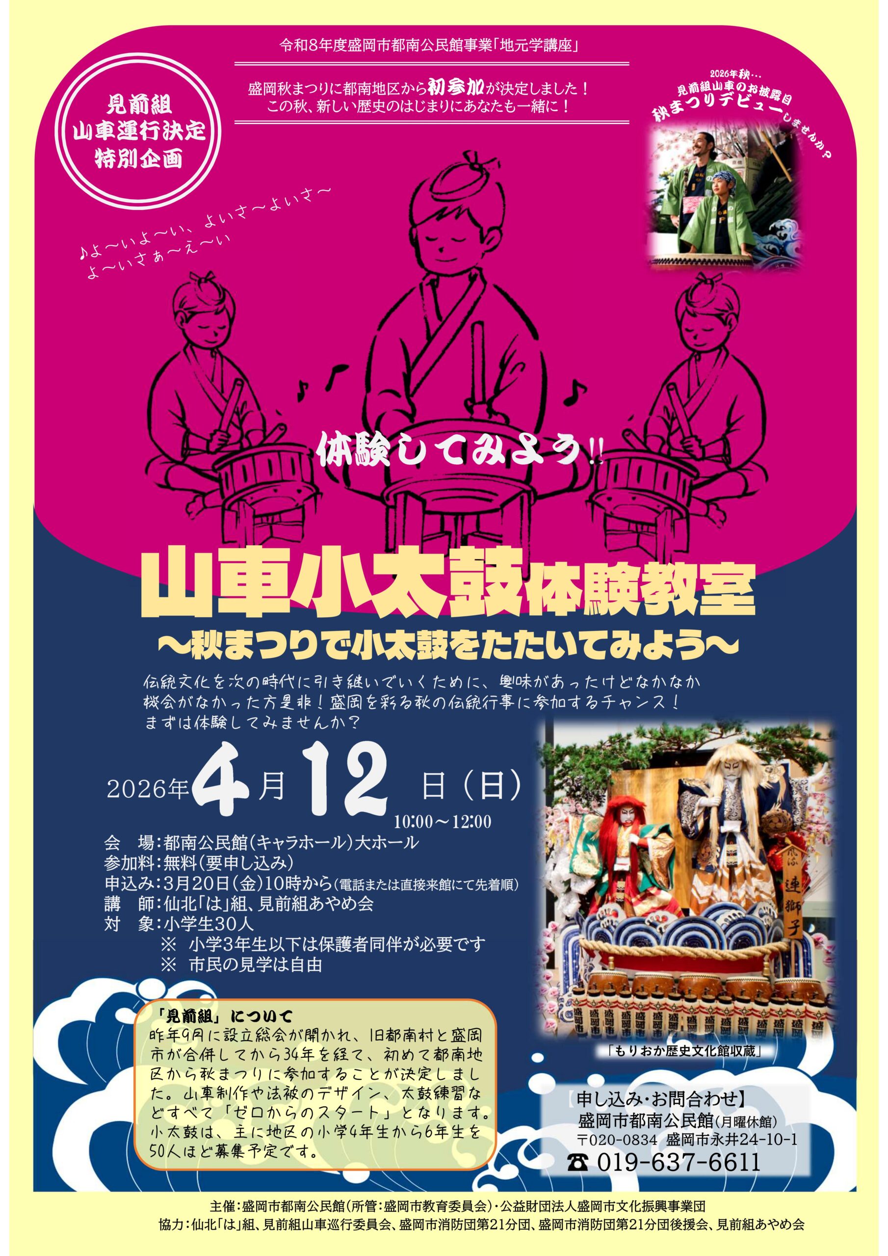 【3月20日(金)10時から受付開始】地元学講座 見前組山車運行決定特別企画「山車小太鼓体験教室~秋まつりで小太鼓をたたいてみよう~」