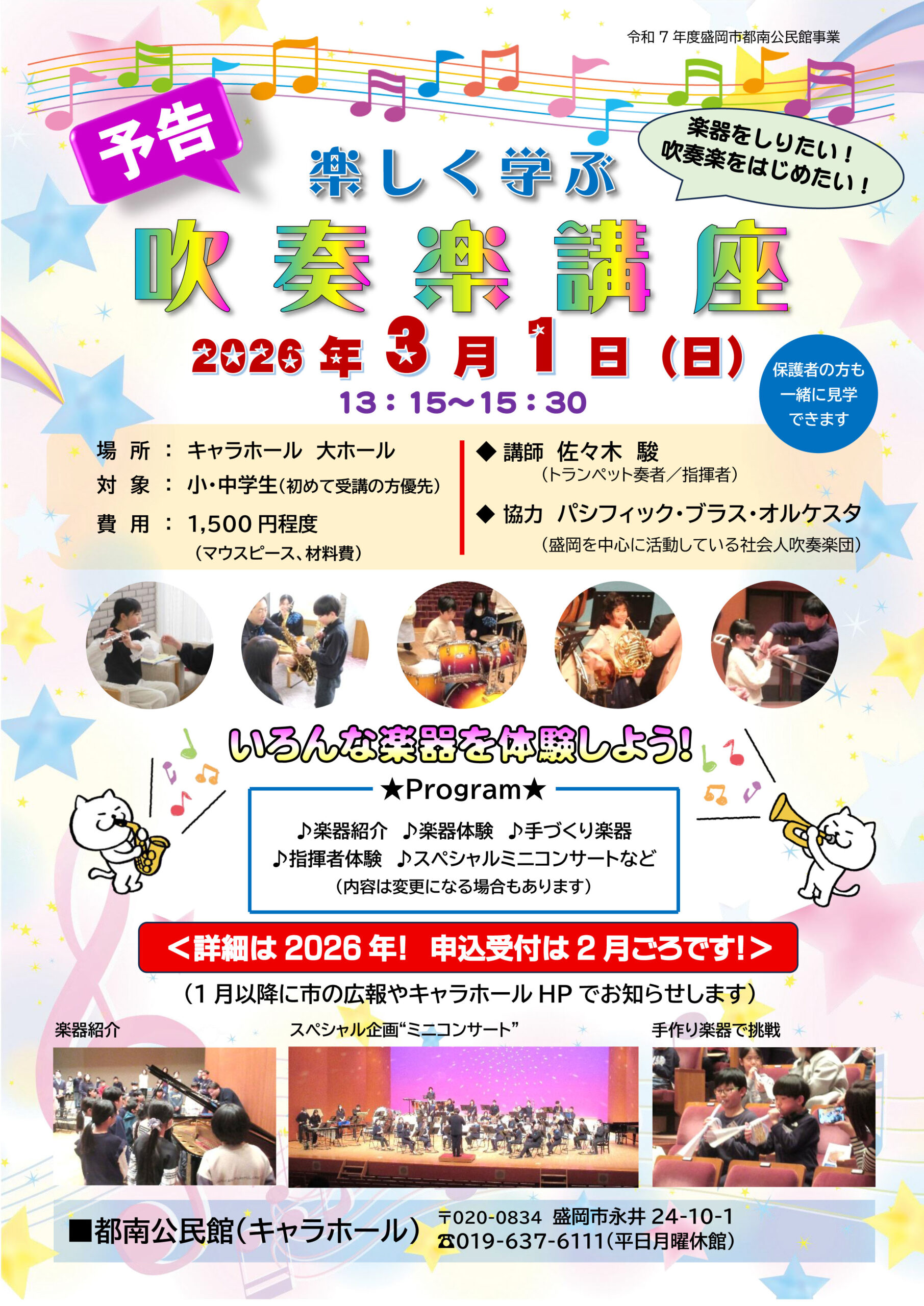 2026年3月1日(日)「楽しく学ぶ吹奏楽講座」開催します!