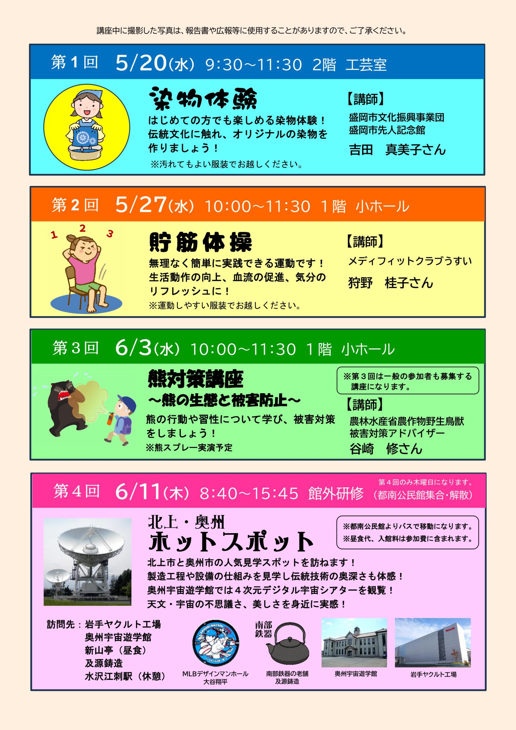 手作り体験、簡単運動、熊対策を学び、第4回はバスに乗って館外研修へ!