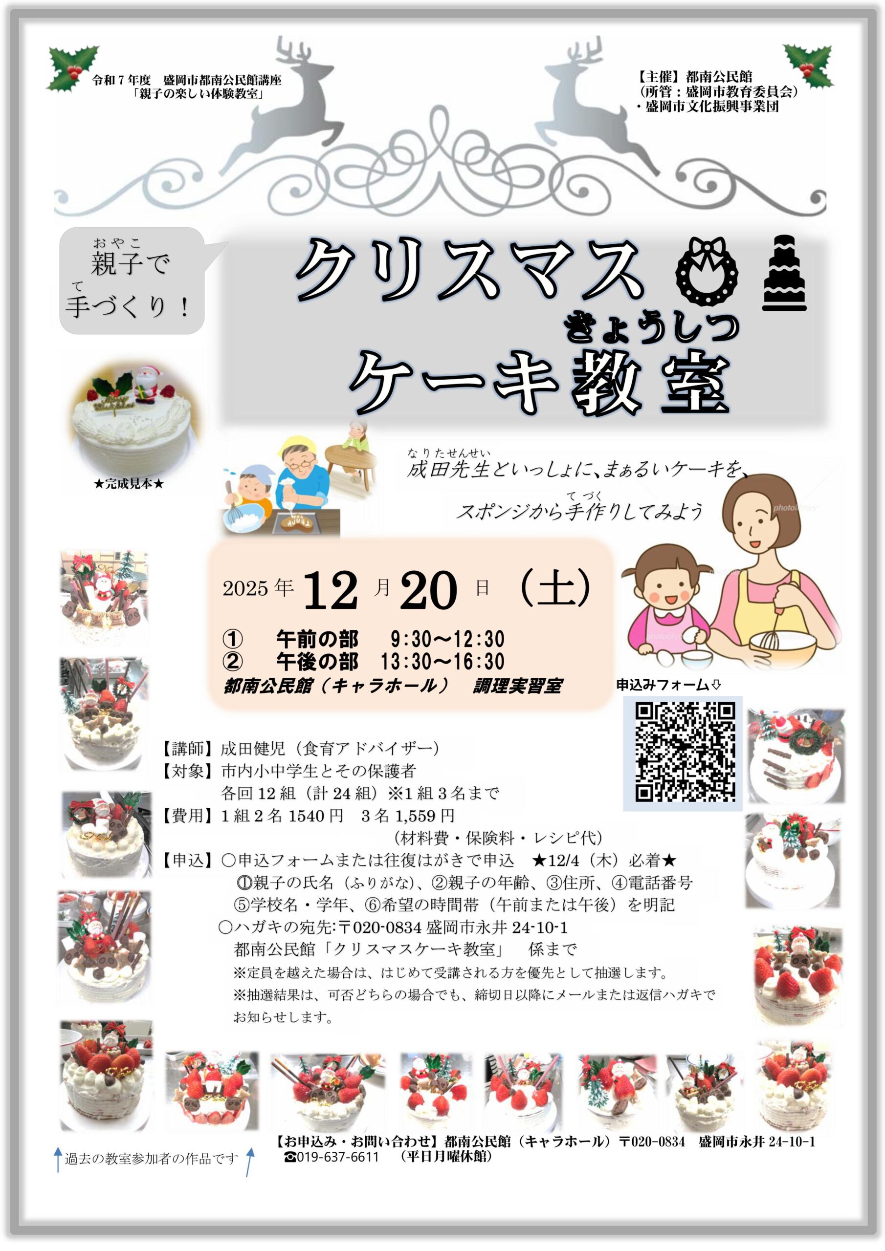 【ハガキの宛先】:都南公民館 〒020-0834 盛岡市永井24-10-1 クリスマスケーキ係 まで ℡637-6611(平日月曜休館)