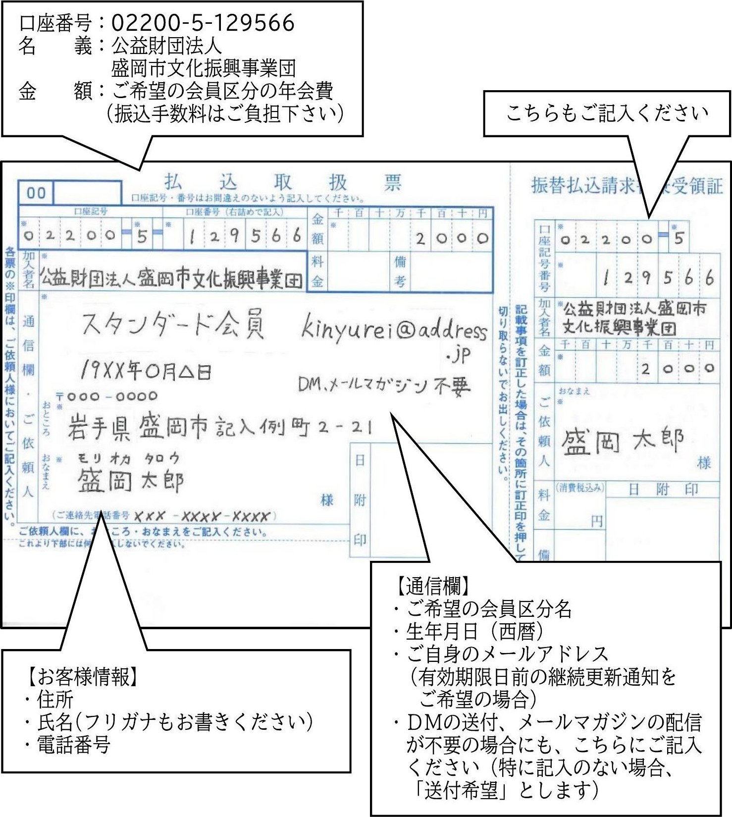 口座番号02200-5-129566 加入者名:「公益財団法人盛岡市文化振興事業団」まで年会費をお振込みください。