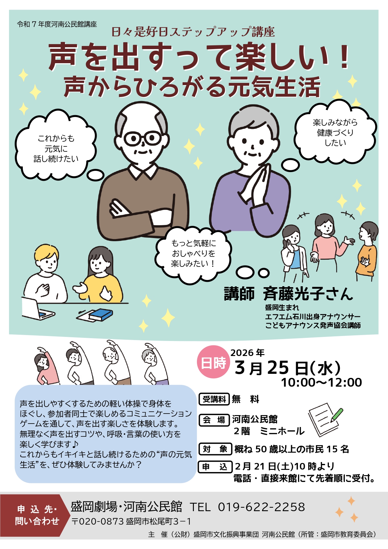 【2/21(土)10時より受付開始】日々是好日ステップアップ講座 「声を出すって楽しい!声からひろがる元気生活」