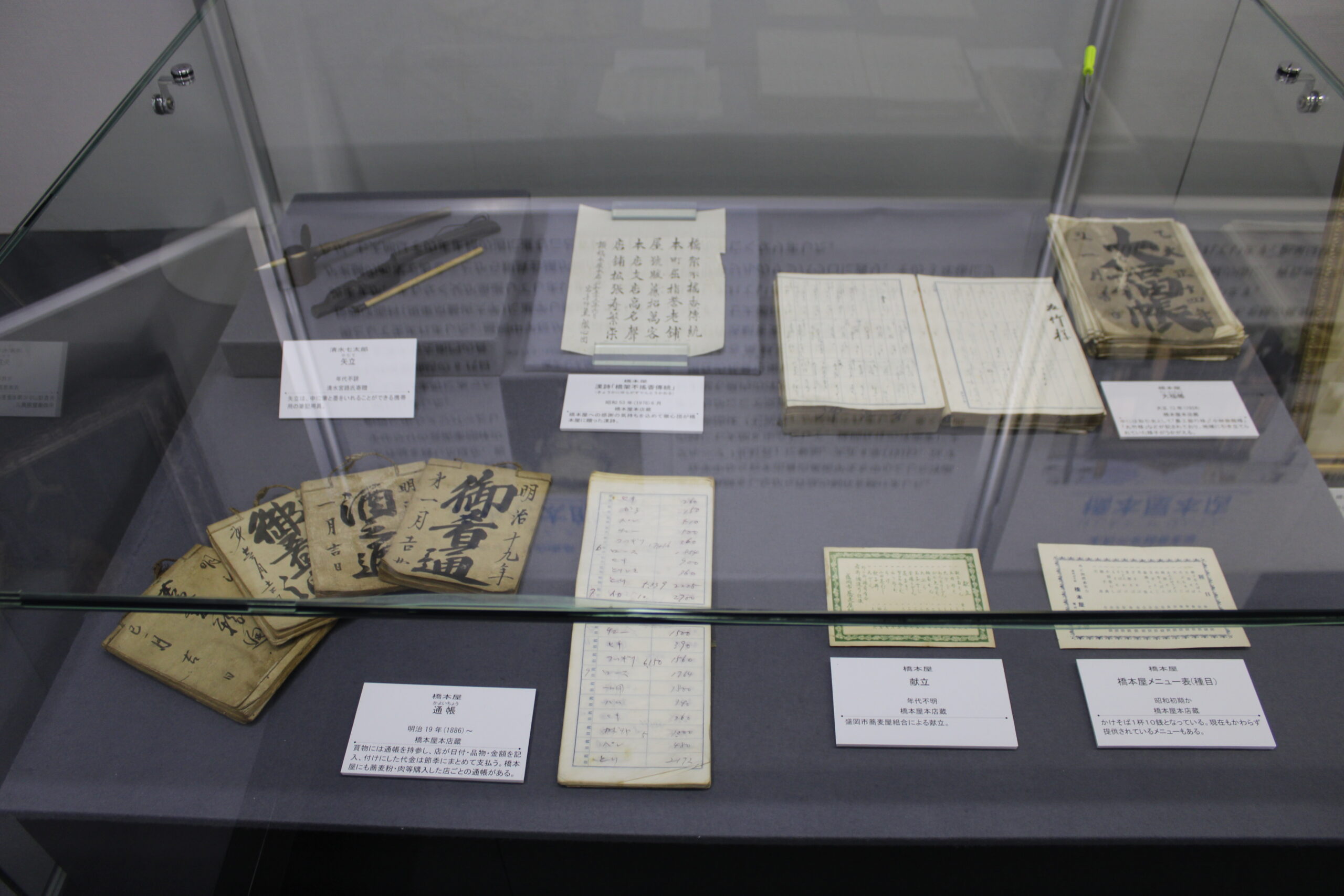 本町の老舗の蕎麦屋です。もともとは上の橋のそばに店を構えたことから「橋本屋」となりました。明治・大正の貴重な帳簿や、岩手師範学校の卒業生から贈られた感謝状と漢詩など、地域に愛されていたことが垣間見える資料を展示しました。