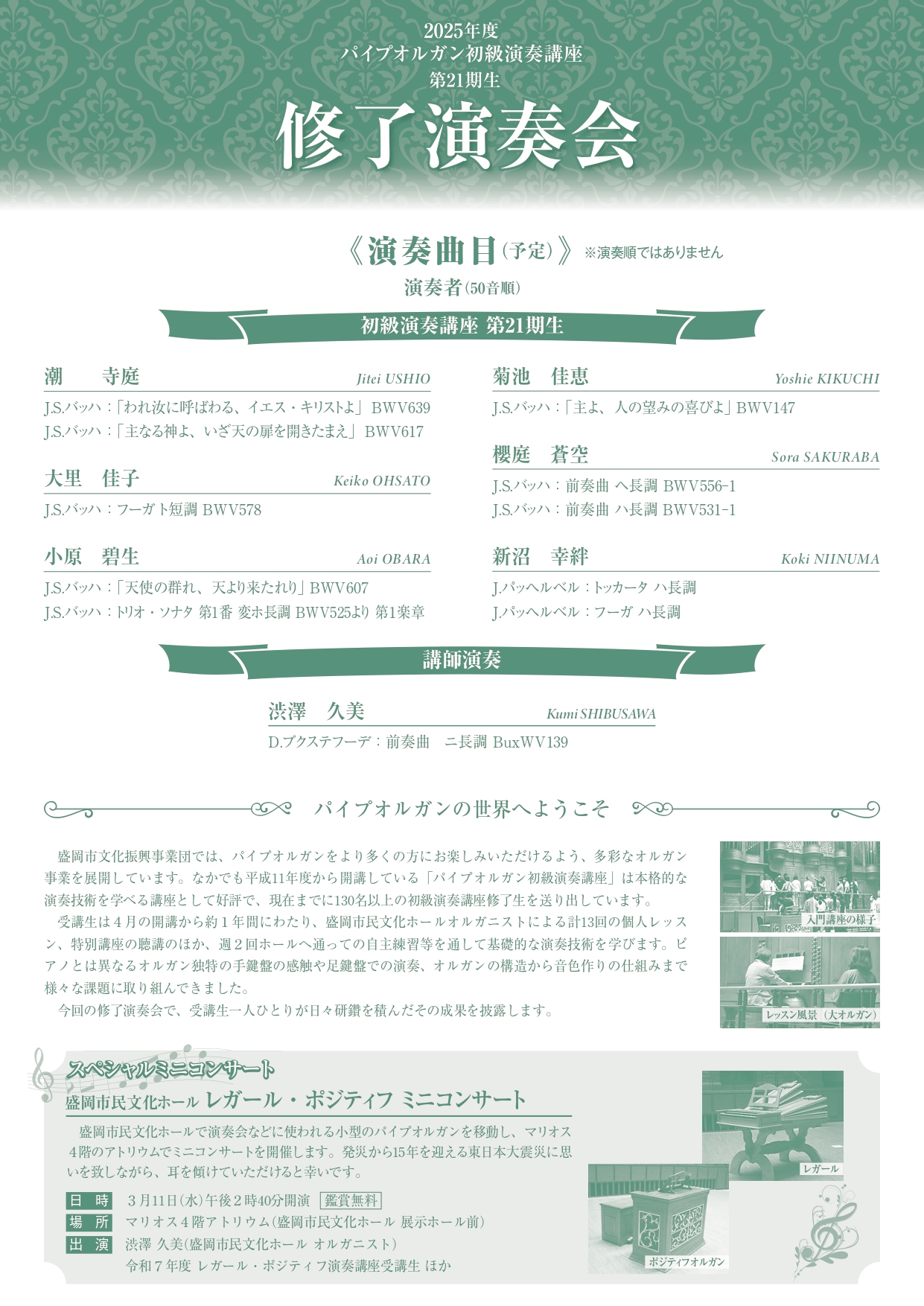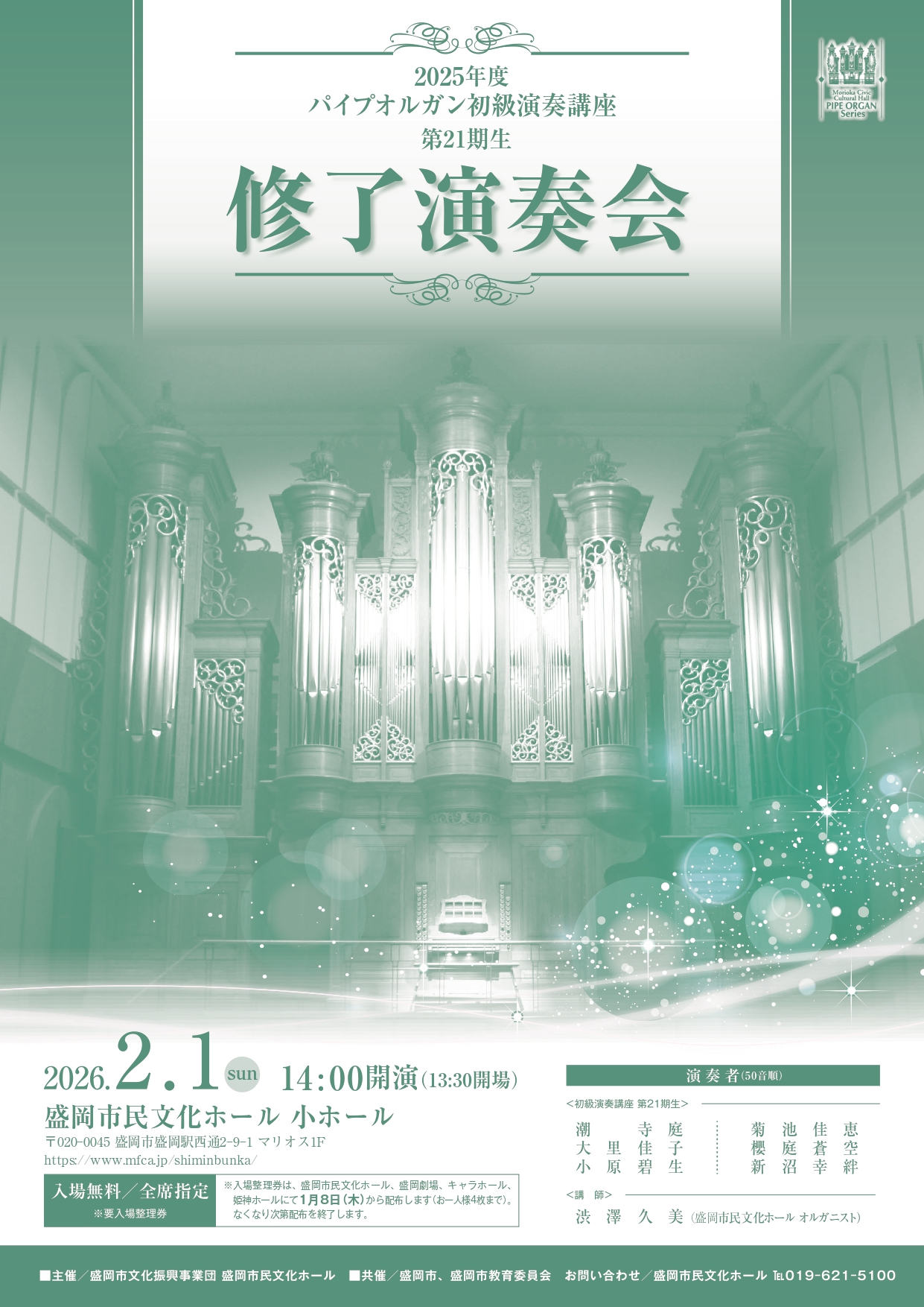 令和7年度パイプオルガン初級演奏講座 修了演奏会 チケット発売日:2026年1月8日(土)から入場整理券配布開始開催日:2026年2月1日(日)時間:14:00開演(13:30開場)場所:小ホール 約1年にわたりレッスンや練習を重ね、基礎的な演奏技術を学ぶパイプオルガン初級演奏講座。 その修了生を対象に、約半年間、大オルガンとはまた違った音色をもつ2台の小型オルガンと向き合い、技術の向上に励むレガール・ポジティフ演奏講座。 それぞれの講座の受講生が、日々研鑽を積んだ成果を披露します。 [出演]2025年度パイプオルガン初級演奏講座 第21期生 渋澤 久美(盛岡市民文化ホール オルガニスト) プレイガイド:盛岡市民文化ホール、盛岡劇場、キャラホール、姫神ホール(お一人様4枚まで)