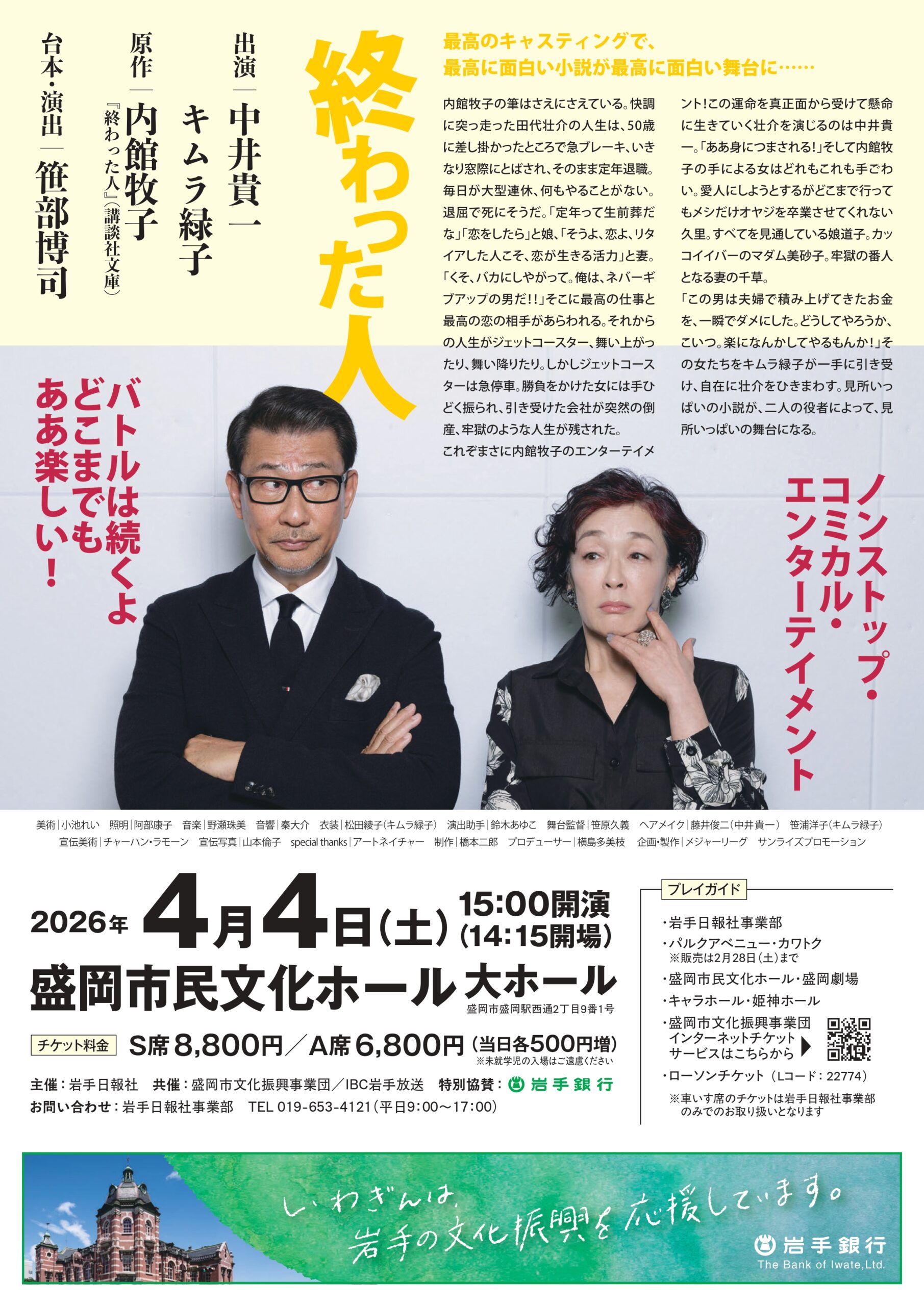 岩手日報社事業部、パルクアベニュー・カワトク(R8.2.28までのお取扱い)、盛岡市民文化ホール、盛岡劇場、キャラホール、姫神ホール、盛岡市文化振興事業団インターネット・チケットサービス、ローソンチケット(Lコード:22774)